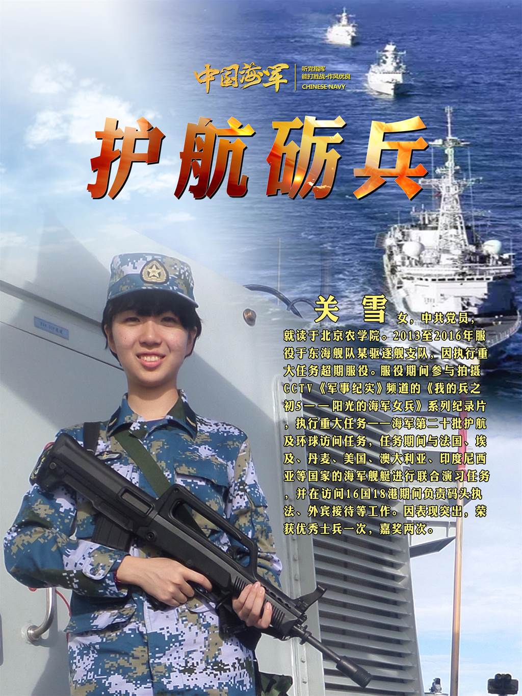 因为父亲和大伯、大姑都曾是军人,他们言语中对部队的回忆,让关雪对这个大熔炉充满了憧憬与向往。2013年9月,关雪考入北京农学院,一开学她就选择携笔从戎,成为了东海舰队的一名舰艇信号兵。