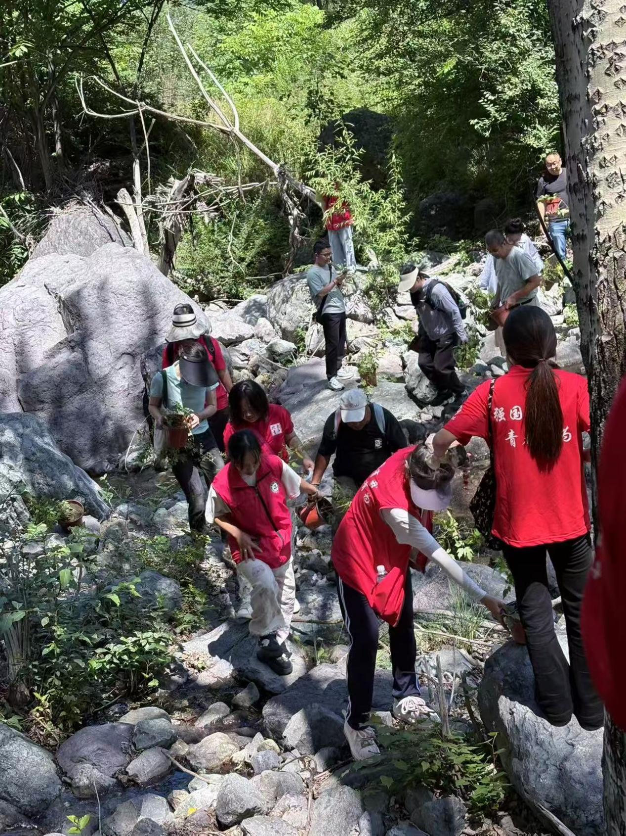 这是继去年102株幼苗回归后,百花山葡萄的又一次大规模野外回归。此刻,团队成员正徒步穿越泥泞山径,将幼苗送往不同海拔的回归点。
