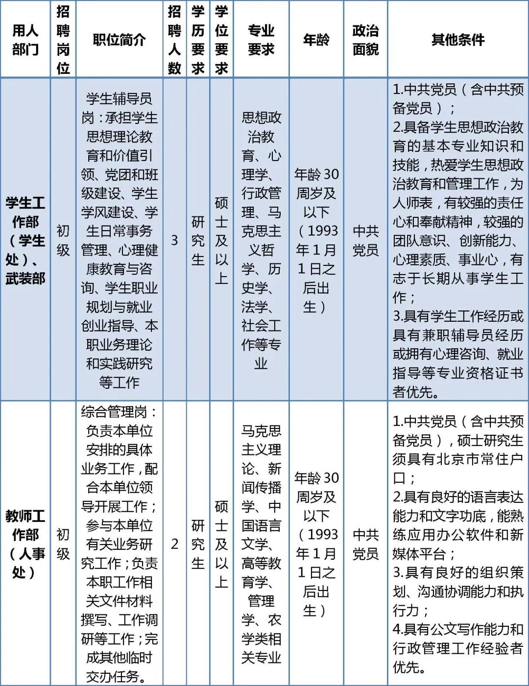 1.普通高等学校2023年应届毕业生及两年内离校未就业(未缴纳职工社会保险)毕业生的,须列入国家统一招生计划,培养方式为非定向,就读最高学历期间未与任何单位存在劳动(录用、聘用)关系、未缴纳职工社会保险,能按时毕业并取得相应学历学位,2023年9月30日前持准备齐全的报到材料到校报到,其中非京籍(未取得北京市常住户口)应聘人员必须符合《北京市引进毕业生管理办法》要求。