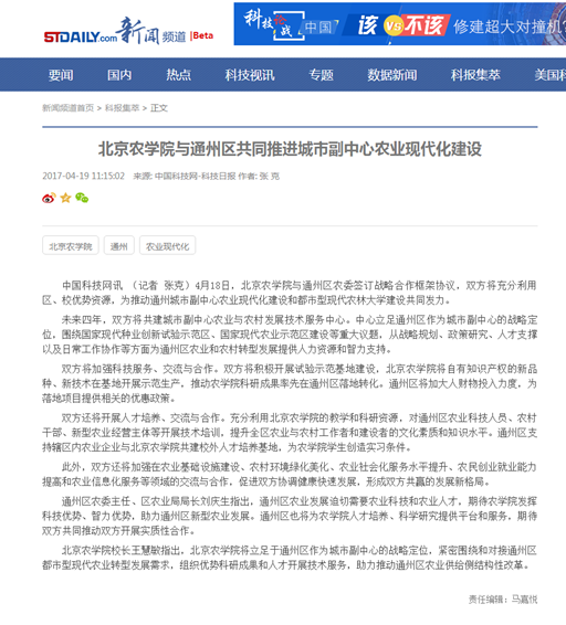 中国科技网讯 (记者 张克)4月18日,北京农学院与通州区农委签订战略合作框架协议,双方将充分利用区、校优势资源,为推动通州城市副中心农业现代化建设和都市型现代农林大学建设共同发力。