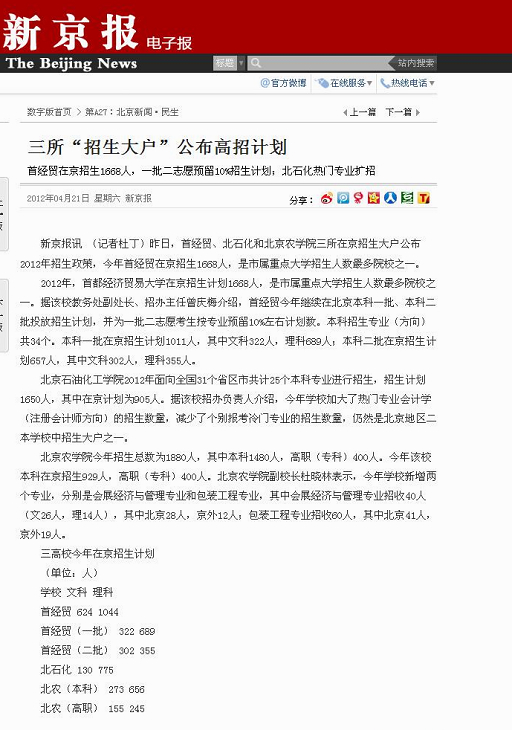 新京报讯 (记者杜丁)昨日,首经贸、北石化和北京农学院三所在京招生大户公布2012年招生政策,今年首经贸在京招生1668人,是市属重点大学招生人数最多院校之一。