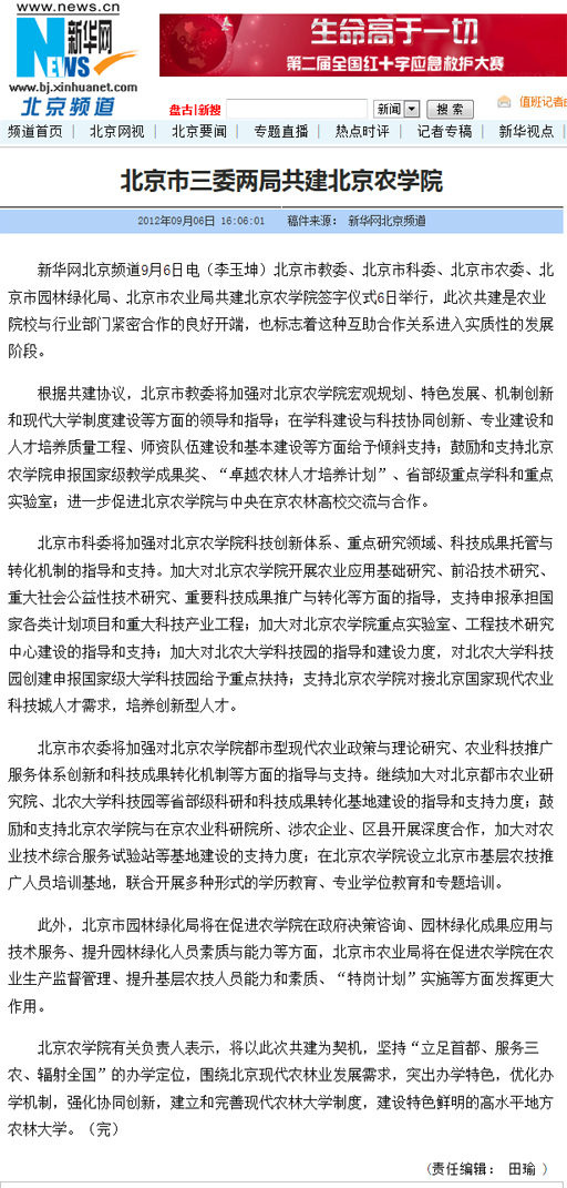 新华网北京频道9月6日电(李玉坤)北京市教委、北京市科委、北京市农委、北京市园林绿化局、北京市农业局共建北京农学院签字仪式6日举行,此次共建是农业院校与行业部门紧密合作的良好开端,也标志着这种互助合作关系进入实质性的发展阶段。
