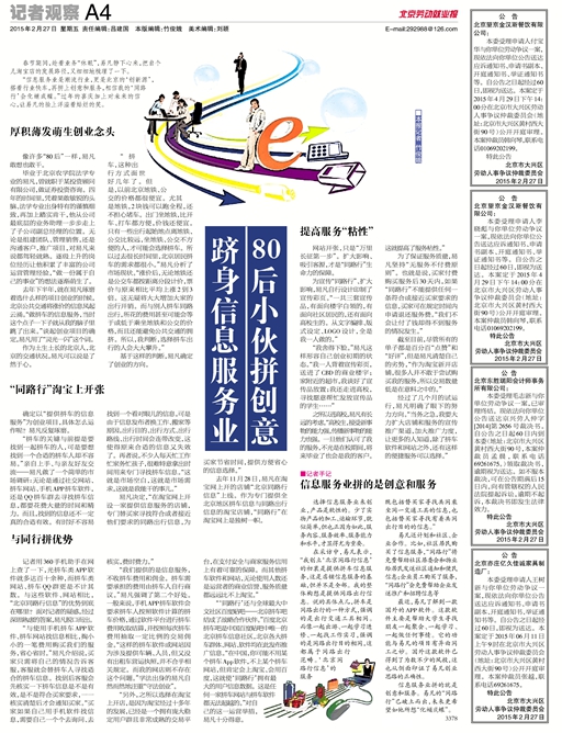 “信息服务业是潮流行业,更是北京的‘创新源’,搭着行业快车,再拼上创意和服务,相信我的‘同路行’会化蛹成蝶。”过年的喜庆加上对未来的信心,让易凡的脸上洋溢着灿烂的笑。