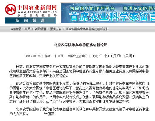 北京农学院副校长姚允聪代表联盟副理事长单位和中关村开放实验室表达了对中兽医药事业的大力支持。 (张丽萍)