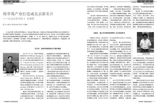从2004 年第一次申办世界草莓大会,到2008 年申办成功,再到2012 年第七届世界草莓大会在京的即将召开,北京草莓产业得到了快速发展,这与北京农学院教授付出的汗水和努力密不可分。近年来,北京农学院的专家教授们结合实验室加田间调研的传统研究模式,采用政、产、学、研、推的方式,加强多个企业、多个部门联合协作,分别从实验设计、田间调研、室内试验、区域示范等多层面入手,不断培训新农民、输送新技术、引进新品种、解决新问题,取得了很好的经济、生态与社会效益。