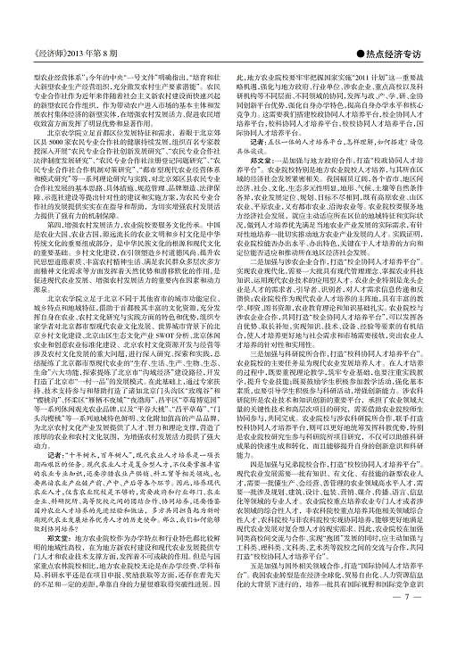 郑文堂:这一点上我想强调四个方面:首先,增强农村发展活力,农业院校要提供人才支持。发展现代农业,增强农村活力,离不开高素质的农业人才支持。既需要一批有文化、懂技术、会经营的新型农民,也需要一批专业精、知识广、素质好的农业专门人才,更需要一批政策熟、视野宽、能力强的乡镇村干部。在这一系列不同层次、不同类别的农业人才培养和教育中,相对于其他高校而言,农业高校具有得天独厚的优势。今年的中央“一号文件”中明确指出,要“大力培育新型农民和农村实用人才,着力加强农业职业教育和职业培训”。作为农业院校,要充分发挥自身在农业教学、科研、师资等资源和平台优势,加强对乡镇干部、农村基层组织负责人、农村一线专业技术人员以及新型农民等群体的继续教育和培训工作,提升他们的农业管理、生产、经营以及农村规划、开发、保护等方面的组织、知识、能力和视野,为增强农村发展活力打造强有力的“专业团队”。近年来,北京农学院以“农村实用人才‘1+1+X’科技培训工程”为载体,以设立在学校的农业部现代农业技术培训基地、北京市新农村建设研究基地、北京市都市农业大学科技园平台为依托,通过开展北京市少数民族乡村基层技术骨干培训班、社区工作者和农村基层干部培训班、农村实用人才现代农业技术培训班、大学生“村官”科技推广能力培训班、农村科技协调员培训班,以及通过“农民进大学”、“田间地头现场培训”、建立“新农民学校”等形式和途径,近三年来共举办各类培训1000余场次,培训农业管理、经营、技术以及农村一线人员50000余人次,为增强农村发展活力打造了一支专业化的人才队伍。