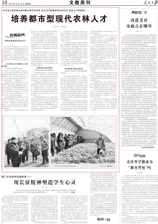 北京农学院党委副书记高东说,经过6次全校范围的教育观念大讨论,全校上下达成了共识:一定要让学生在实践中学习,通过从校内到多个实践基地、再到企事业单位的实践实习,与社会需要对接,从而大大提升学生理论联系实际、解决都市现代农业发展关键问题的能力。