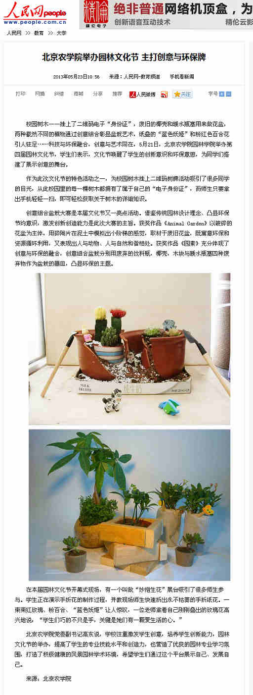 校园树木一一挂上了二维码电子“身份证”,废旧的椰壳和暖水瓶塞用来做花盆,两种截然不同的植物通过创意组合彰显盆栽艺术,纸叠的“蓝色妖姬”和粉红色百合花引人驻足……科技与环保融合,创意与艺术同在,5月21日,北京农学院园林学院举办第四届园林文化节,学生们表示,文化节唤醒了学生的创新意识和环保意识,为同学们搭建了展示创意的舞台。