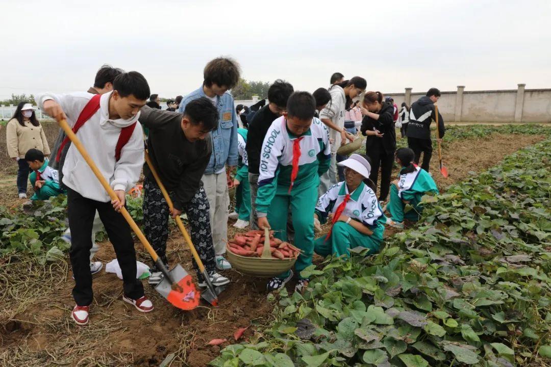 同学们拨开郁郁葱葱的红薯秧,小心翼翼地用铁锹铲开秧子根部的土,看见土地里冒出红色的红薯,按照老师教授的方法,在周边用力向下铲动土壤,再使劲一掀,终于将红薯从地里翻出来,喜悦之情溢于言表。