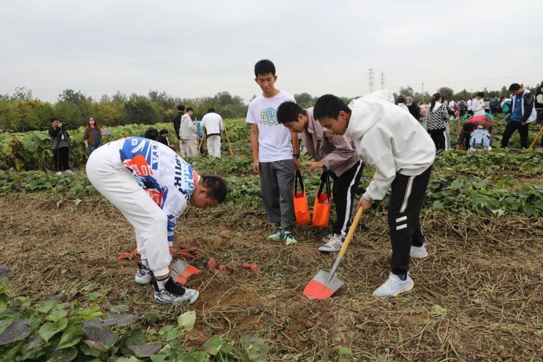 “红薯是朝下长的,挖的时候要用铁锹在它周边往下往深里挖,不然容易‘伤’到红薯。另外,拇指粗的小红薯也很香甜,要‘颗粒归仓’,不要浪费粮食。”采收之前,北京农学院农学系副教授赵波先为同学们上了一堂生动的农事课,向同学们讲解挖红薯、刨花生、收割稻子的“秘诀”,并介绍了甘薯的特色。“同学们现在采收的甘薯是‘北农’特色的甘薯,是我们团队近年来推广的甘薯新品种,育苗技术也是我们团队特有的。”