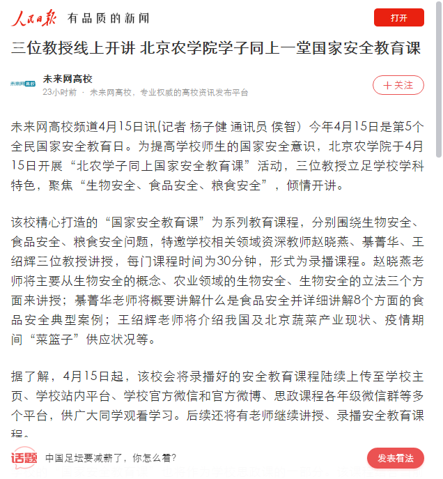 [人民日报客户端]三位教授线上开讲 北京农学院学子同上一堂国家安全教育课
