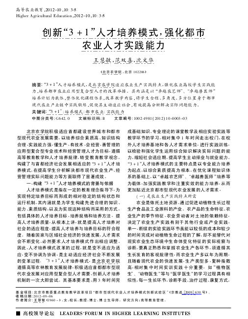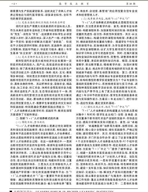 北京农学院积极适应首都建设世界城市和都市型现代农业发展需要,以培养综合素质高、知识结构合理、实践能力强,懂生产、有技术、会经营、善管理的应用型复合型专业技术和经营管理人才为目标,遵循高等教育教学和人才培养规律,转变教育教学观念,构建了与首都经济社会发展相适应的“3 +1”人才培养模式,在提高学生分析解决都市现代农业生产、经营管理实际问题能力等方面取得了显著成效。