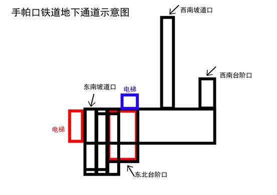 为解决道口交通拥堵情况,北京市规划和国土资源管理委员会曾批准了一项工程,将手帕口铁道口这样的平面道路改为立交式道路,让道口两侧人员和车辆从地下通过。这本是个不错的设想,但随着这个道口主体工程在今年修建完成,来往两侧的居民们却发现地下通道在设计上给他们带来诸多不便。由于通道是修在火车铁轨之下,通道修得很深,出入口台阶坡度非常大。陡峭的阶梯对老人、残疾人、小孩、骑乘自行车的居民来说,通过非常艰难。 因为阶梯道不好走,居民纷纷选择坡度较缓的无障碍通道。无障碍通道是供轮椅进出的通道,宽度不足2米,且有多个直角拐角,不是一条笔直的通道,而自行车、电动车、摩托车和行人都混行在其中,很不安全。由于居民往来道口不便导致通行次数减少,道口两侧的超市、饭馆、商店的营业情况也因此受到影响。