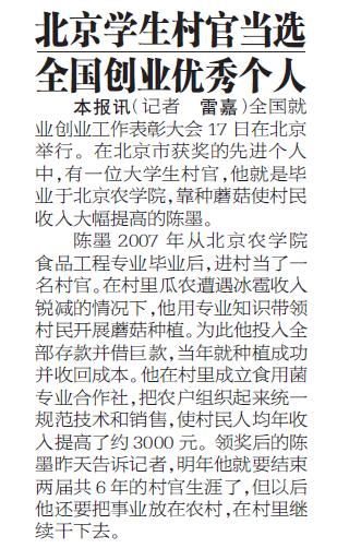 本报讯 全国就业创业工作表彰大会17日在北京举行。在北京市获奖的先进个人中,有一位大学生村官,他就是毕业于北京农学院,靠种蘑菇使村民收入大幅提高的陈墨。