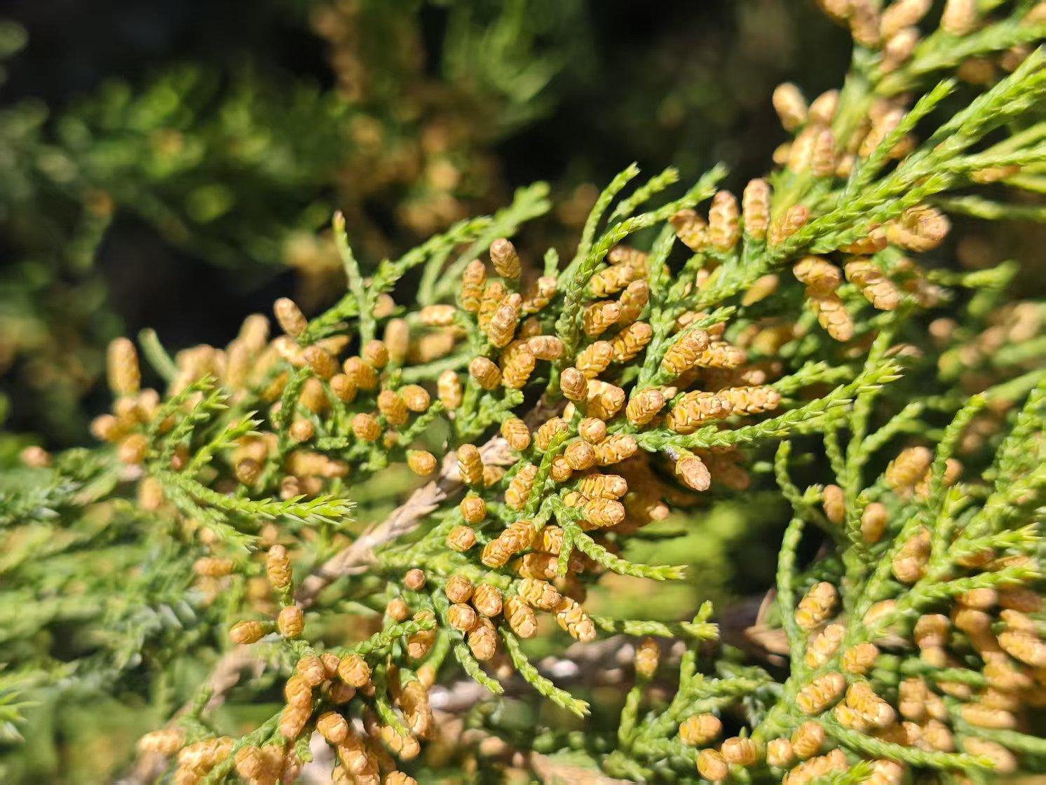 青翠的圆柏满树金黄,大风一吹,雄株球花爆裂,黄色的花粉喷出,飘散如沙雾。近些天来,对柏科花粉过敏的市民出现了眼睛痒、打喷嚏、流鼻涕的症状,着实度过了艰难的两周。