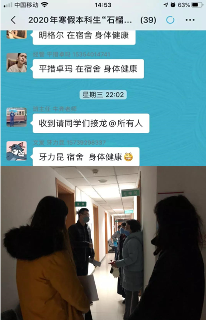在这个与疫情抗争的寒假里,北京农学院校党委组织在校的29名本科生成立了临时班集体,取名“石榴籽”,寓意“团结一心,携手战‘疫’”。学生工作部部长刘柳及植物科学技术学院党总支副书记牛奔担任临时班主任。