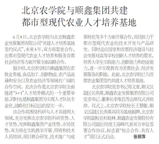 6月8日,北京农学院与北京顺鑫农业发展集团有限公司“共建人才培养基地签约仪式”,未来5年,双方将紧密合作,在都市型现代农业人才培养和服务首都社会经济等方面开展全面战略合作。