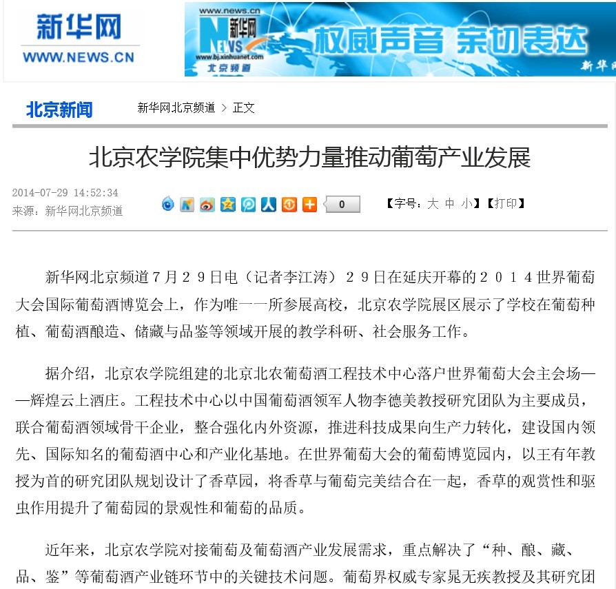 近年来,北京农学院对接葡萄及葡萄酒产业发展需求,重点解决了“种、酿、藏、品、鉴”等葡萄酒产业链环节中的关键技术问题。葡萄界权威专家晁无疾教授及其研究团队,先后在西北、华北、华中、华东地区等葡萄主产区建立葡萄科普示范基地60多万亩。晁无疾教授团队受农业部和各地政府的委托,先后主持制订了葡萄栽培技术农业行业标准和地方行业标准,主持完成了“全国葡萄优势区域规划”,指导建立了多个万亩葡萄丰产商品化生产基地。(完)