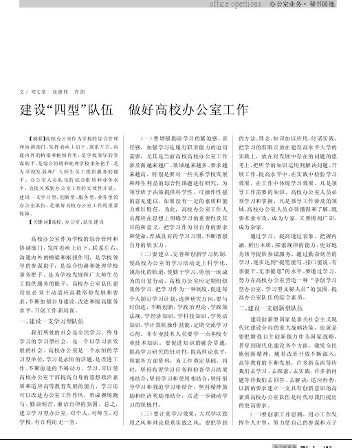 【摘要】高校办公室作为学校的综合管理和协调部门,发挥着承上启下、联系左右、沟通内外的桥梁和枢纽作用,是学校领导的参谋助手,是综合协调和处理学校事务把手、是为学校发展和广大师生员工提供服务的能手。办公室人员队伍的综合素质和业务水平,直接关系到办公室工作的实效性开展。建设一支学习型、创新型、服务型、业务型的办公室队伍,是做好高校办公室工作的重要保障。