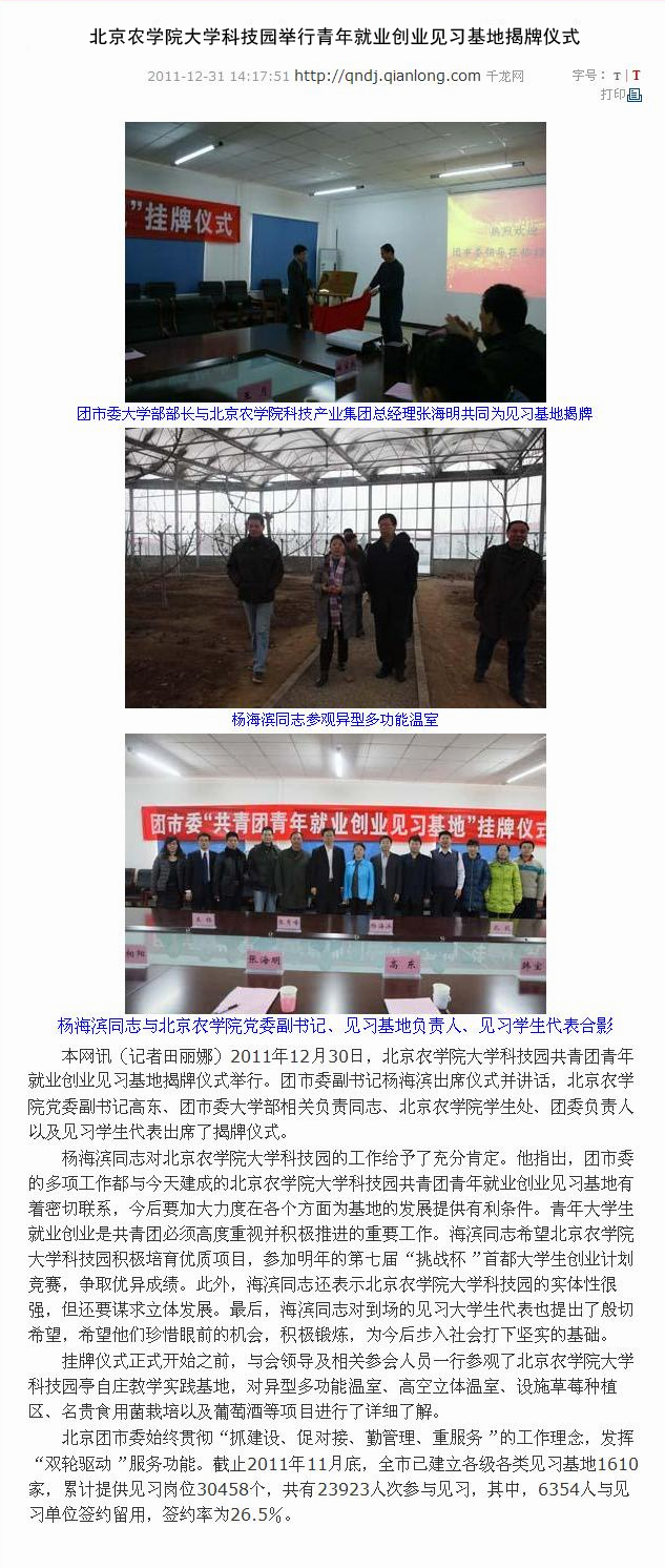千龙网讯(记者田丽娜)2011年12月30日,北京农学院大学科技园共青团青年就业创业见习基地揭牌仪式举行。团市委副书记杨海滨出席仪式并讲话,北京农学院党委副书记高东、团市委大学部相关负责同志、北京农学院学生处、团委负责人以及见习学生代表出席了揭牌仪式。