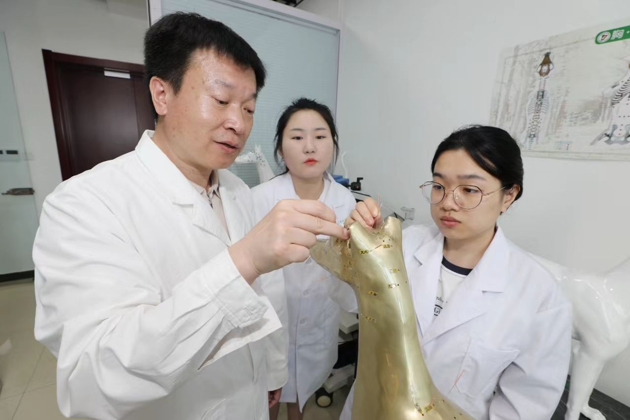 姜代勋使用自主研发设计的“针灸铜犬”开展教学