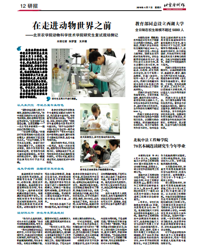 北京农学院动物科学技术学院研究生复试面试4月3日举行。选择动物医学与动物科学专业,考生都是出于对动物健康养殖、动物医学的关注,以及对动物的热爱。但在愉快地迈入动物世界的科学大门之前,在研考笔试之后,考生还要凭借所学通过综合面试、实验技能掌握的层层考核。考试当天,记者走进了北京农学院动物科学技术学院的复试面试与操作考试现场。
