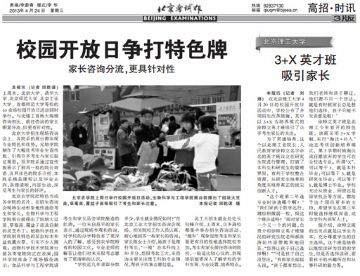 上周末,北京大学、清华大学、北京师范大学、北京工业大学、首都师范大学等校的10余场校园开放日活动同时举行。与北建工首场大规模咨询相比,前往咨询的家长明显分流,但更有针对性。