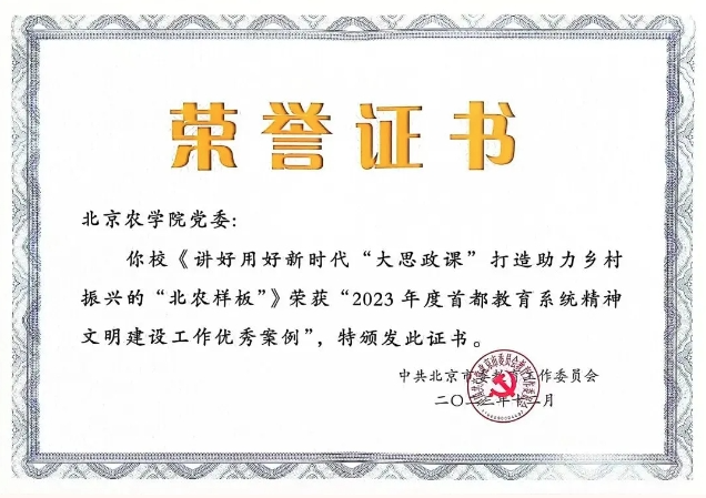 北京农学院报送的“讲好用好新时代‘大思政课’ 打造助力乡村振兴的‘北农样板’”文明实践案例获评“2023年度首都教育系统精神文明建设工作优秀案例”,这是学校继获得“北京高校精神文明建设工作十佳案例”后又一重要奖项。