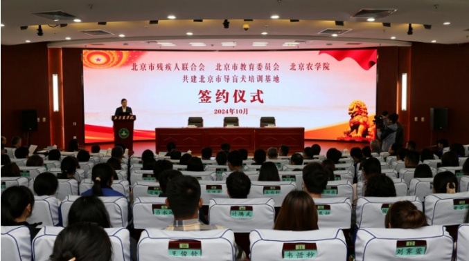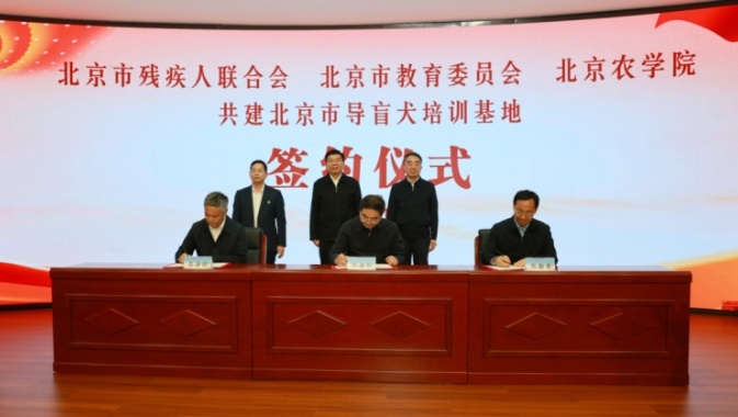 10 月31日,北京市残疾人联合会、北京市教育委员会、北京农学院共建北京市导盲犬培训基地签约仪式在北京农学院举行。北京市残疾人联合会党组书记、理事长陆晓光,北京市委教育工委委员、市教委副主任张耀天,北京市残疾人福利基金会理事长侯玉兰,北京农学院党委书记赵锋,党委副书记、院长段留生出席签约仪式。