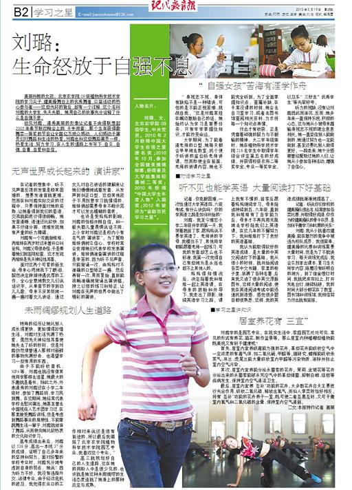 初见刘璐,清秀美丽的形象让记者不由得联想起2005年春节联欢晚会上的《千手观音》,那个当年获得歌舞类一等奖的节目让全国亿万观众感动,人们感动于演员们对舞蹈和生活的热爱。刘璐也和这些舞蹈演员一样,热爱生活、努力学习,在人生的道路上书写下:自立、自强、自尊、自爱和自信。