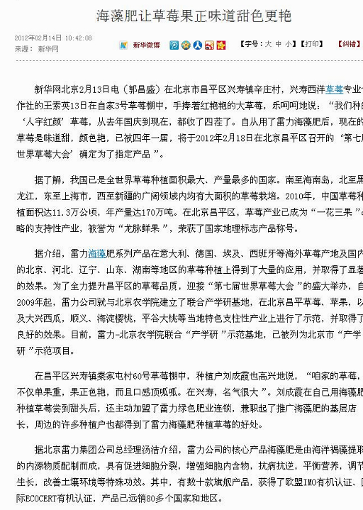 新华网北京2月13日电(郭昌盛)在北京市昌平区兴寿镇辛庄村,兴寿西洋草莓专业合作社的王素英13日在自家3号草莓棚中,手捧着红艳艳的大草莓,乐呵呵地说:“我们种的‘人宇红颜’草莓,从去年国庆到现在,都收了四茬了。自从用了雷力海藻肥后,现在的草莓是味道甜,颜色艳,已被四年一届,将于2012年2月18日在北京昌平区召开的‘第七届世界草莓大会’确定为了指定产品”。