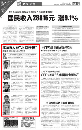 张喜忠:男,1959年生,北京老兵保洁服务中心经理。他退伍来京创业搞保洁,为居民疏通下水道;他为社区孤寡老人提供全天24小时义务服务;他数次志愿参加抢险救灾,冒着危险抢救人民生命财产;他为家乡父老送去生活用品,为学校捐书修路。他被称为“新时代的时传祥”。