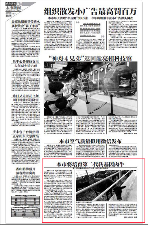 记者了解到,“萌萌”和“妞妞”出生于2012年7月和8月。作为国家转基因重大专项——优质高效转基因肉牛新品种培育的团队,中国农科院北京畜牧兽医所和北京农学院的科学家们的目标是:培育出中国产的、肌肉中均匀分布大理石纹理样脂肪的高级肉牛,让国人能吃上国产的“雪花牛肉”。为此,团队花了3年时间,在400多头牛身上做过实验,最终将脂肪性脂肪酸结合蛋白基因(A-FABP)转入中国名牛——秦川牛的胎儿成纤维细胞内,再用体细胞克隆技术,把含A-FABP成纤维细胞注射到成熟的去核卵子内,使其体外发育成重构胚胎,最后把胚胎移植进同期发育的母牛子宫内,最终产出含A-FABP的牛犊——即“萌萌”和“妞妞”。