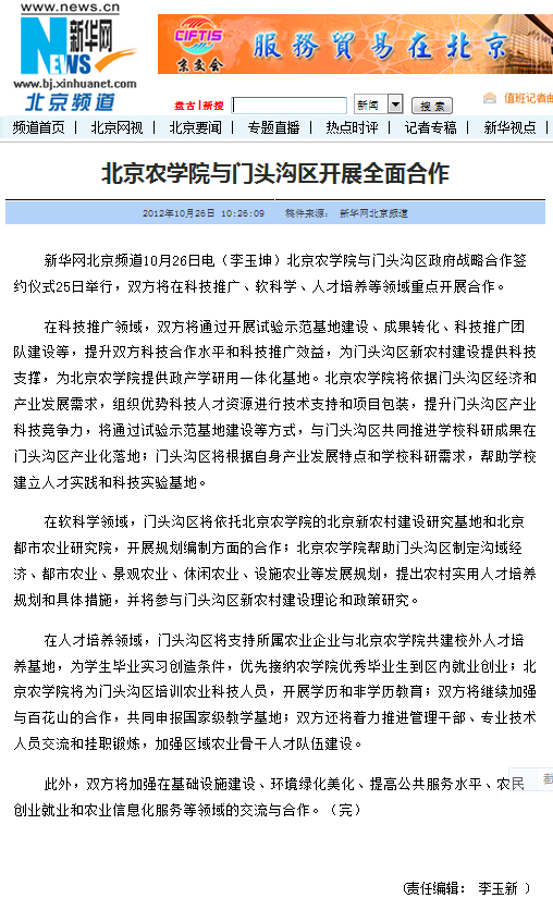 新华网北京频道10月26日电(李玉坤)北京农学院与门头沟区政府战略合作签约仪式25日举行,双方将在科技推广、软科学、人才培养等领域重点开展合作。