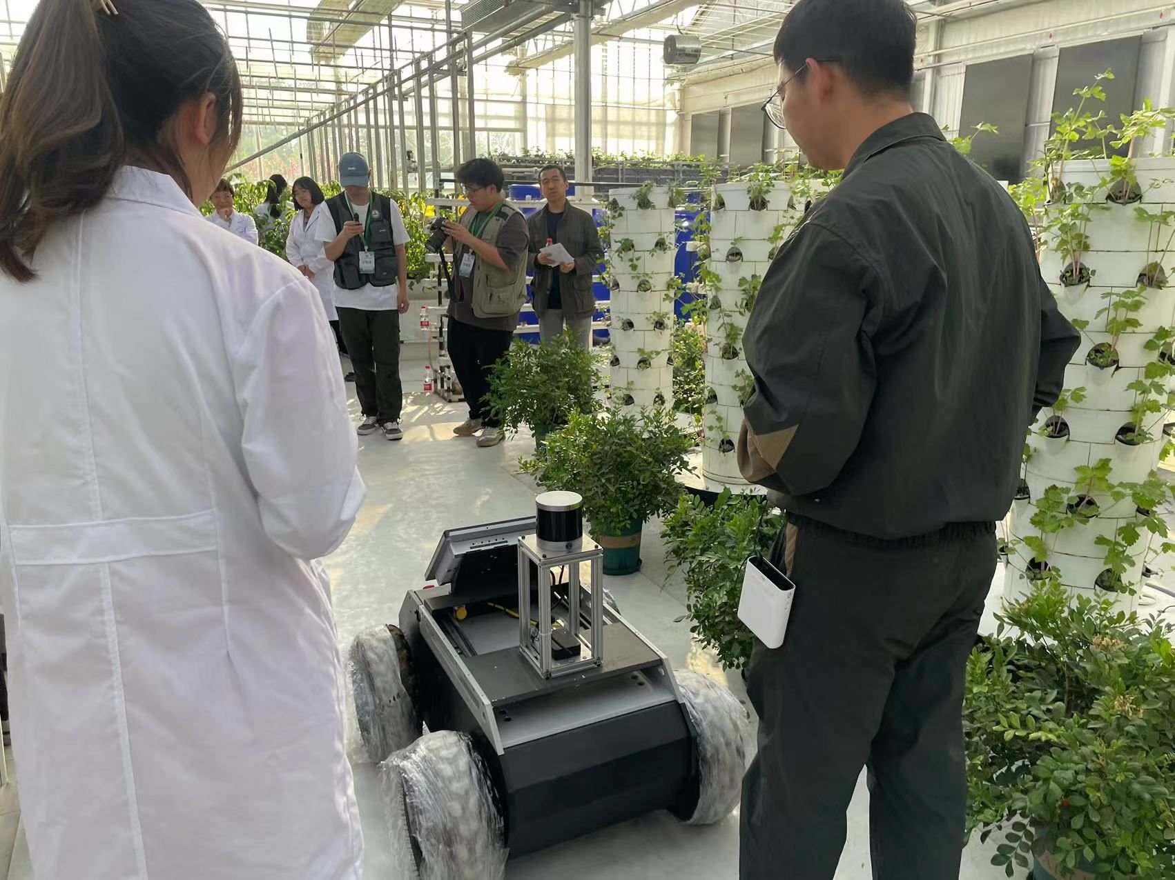 智能温室内,有教师带着学生们在测定无土栽培蔬菜的营养液EC值(衡量营养液浓度的指标),来判断营养液中需要补充的营养成分和用量。同时可以看到,一个机器人在栽培架之间行走,这是该校设施农业科学与工程专业师生自己编写算法研制的环境信息收集车,用于收集植物信息、环境参数、作物成熟度、作物病虫害等数据,通过AI赋能,代替人力对作物进行监测。