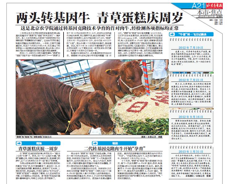 一年前出生在北京农学院实验基地的两头转基因克隆肉牛“萌萌”和“妞妞”昨天迎来了1周岁生日。系上大红花的两头牛享受了农学院师生为它俩特制的“苜蓿青草生日蛋糕”。这是本市首对通过转基因克隆技术孕育的肉牛。一年来,它俩不仅健康成长,长成了三四百公斤的大牛,而且通过了科学考验——经国际权威机构检测,两头牛转入的大理石花纹状肉质基因没有发生基因突变或漂移。