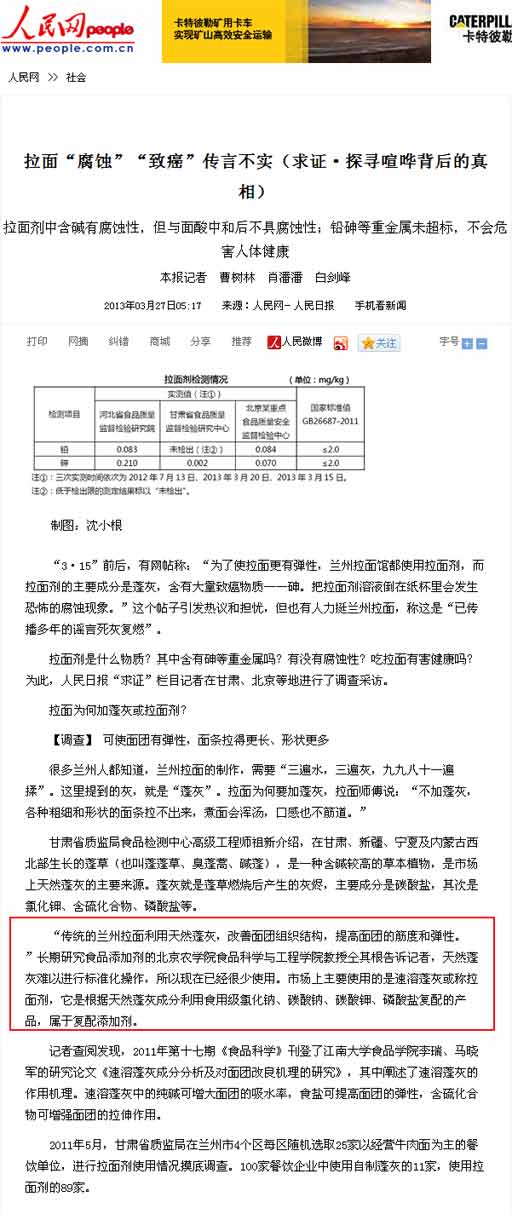 “3·15”前后,有网帖称:“为了使拉面更有弹性,兰州拉面馆都使用拉面剂,而拉面剂的主要成分是蓬灰,含有大量致癌物质——砷。把拉面剂溶液倒在纸杯里会发生恐怖的腐蚀现象。”这个帖子引发热议和担忧,但也有人力挺兰州拉面,称这是“已传播多年的谣言死灰复燃”。