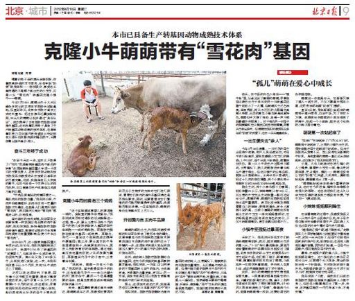 今年7月19日,萌萌出生于大兴区磁各庄附近的北京农学院综合试验基地。但直到昨天,北京农学院才首次正式对外宣布:经过血液和毛囊实验检测,26天大的萌萌已初步通过“身份认证”,成功携带了含有脂肪性脂肪连接蛋白基因。这标志着北京终于具备了生产转基因动物成熟的技术体系。也意味着北京乃至全国百姓有望早日吃到拥有大理石花纹般肉质的精品肥牛,无需依靠从国外高价进口。
