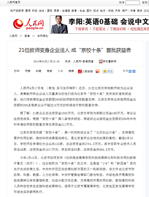 人民网4月17日电 (熊旭 实习生邱瑞昕)近日,21位北京农学院教师成为企业法人。身兼教师和企业法人双重身份的他们成为北京市“京校十条”发布后的首批获益者。他们将获得现金出资额度20%的政府股权投资配套支持,北京农学院也将按照现金出资额的20%且每家企业不超过15万元的标准进行股权配套支持。