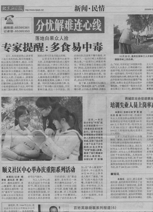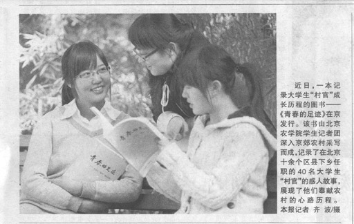 近日,一本记录大学生“村官”成长历程的图书——《青春的足迹》在京发行。该书由北京农学院学生记者团深入京郊农村采写而成,记录了在北京十余个区县下乡任职的40名大学生“村官”的感人故事,展现了他们奉献农村的心路历程。