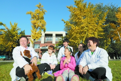 昨天,在北京农学院校园里,动科系的师生与身患“忧郁症”的小狗一起互动玩耍,享受和美秋色。许多宠物因主人上班时被独自关在家中而患上“忧郁症”,在秋色宜人的校园里与他人快乐地互动,更有利于它们迅速康复。本报特约摄影 孙山