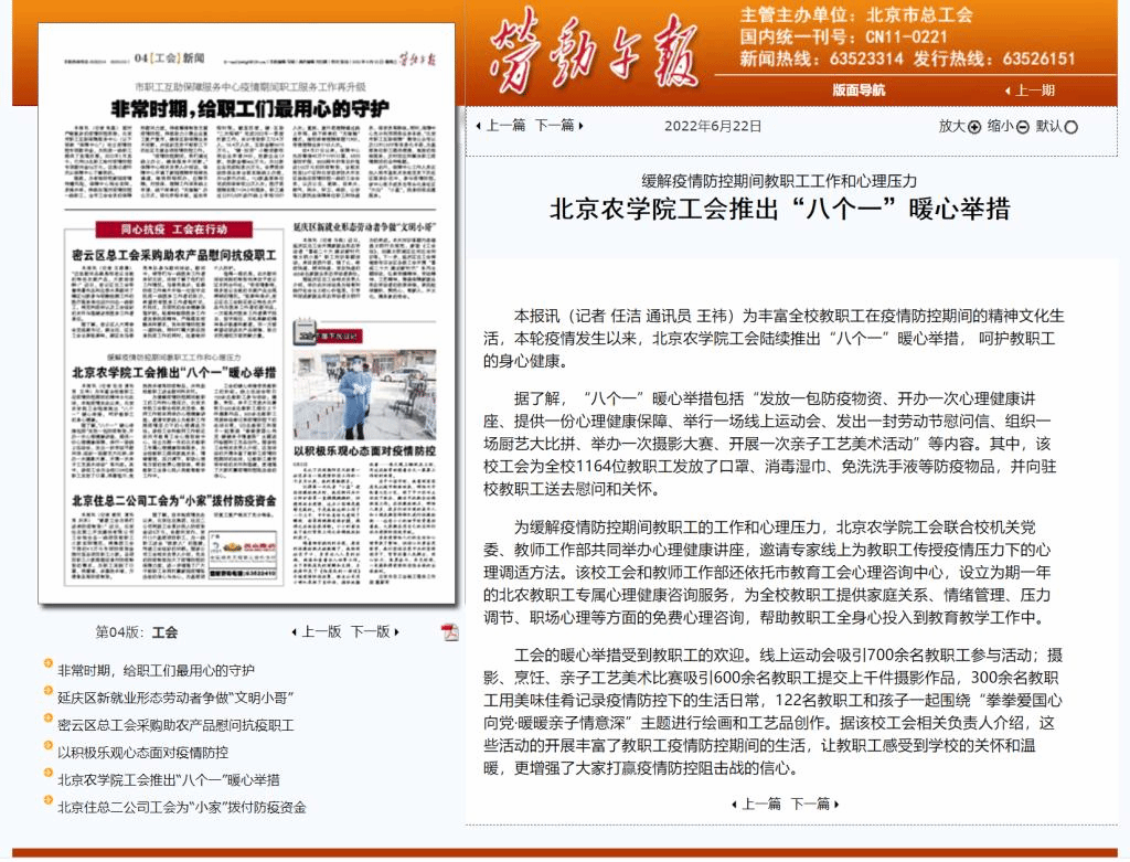 为缓解疫情防控期间教职工的工作和心理压力,北京农学院工会联合校机关党委、教师工作部共同举办心理健康讲座,邀请专家线上为教职工传授疫情压力下的心理调适方法。该校工会和教师工作部还依托市教育工会心理咨询中心,设立为期一年的北农教职工专属心理健康咨询服务,为全校教职工提供家庭关系、情绪管理、压力调节、职场心理等方面的免费心理咨询,帮助教职工全身心投入到教育教学工作中。
