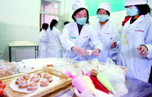昨日,北京农学院,学生们在学习制作宫廷糕点。当日是北京农学院第二届食品节,食品系学生们亲手制作了“风味宫廷扣碗酪”和各种糕点供全校师生品尝。据介绍,制作蛋糕、焙烤、饮料加工等“手艺”都是农学院教学实践课内容。