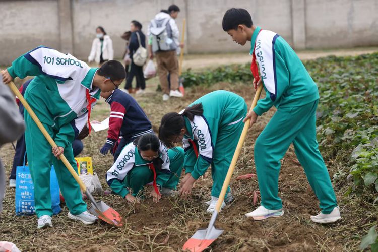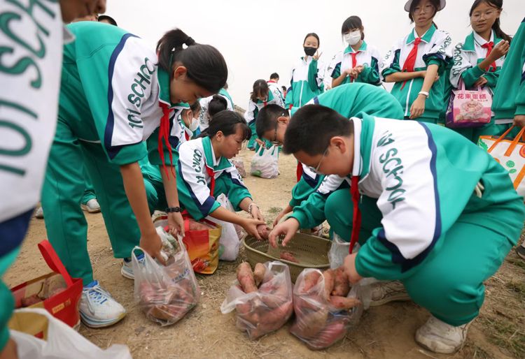 同学们收获了“北农”特色的甘薯,该甘薯是北京农学院团队近年来推广的甘薯新品种。