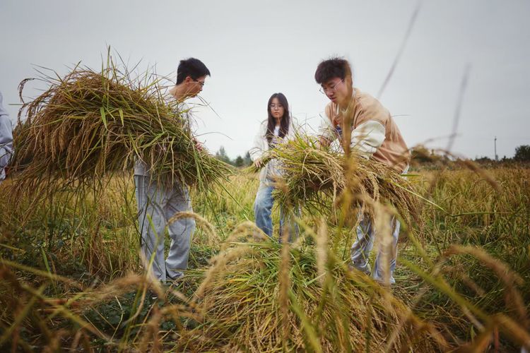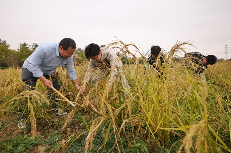 10月16日,“大手拉小手,共享丰收景”秋收节在北京农学院耕读教育实践基地举行。来自北京农学院、北京大学、北京科技大学、华北电力大学、中国音乐学院、北京市第一〇一中学昌平实验学校的近600名师生共采丰收果实,同上一堂田间地头“大思政课”。图为北京农学院教师辅导学生收割农作物。