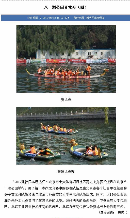 “2012建行民本通达杯·北京市十大体育项目社区赛之龙舟赛”近日在北京八一湖公园举行。据了解,本次龙舟赛事的参赛队伍是由北京市各个社会单位组建的40多支龙舟队伍和来自北京市各高校的大学生龙舟队伍组成。同时,近1500名市民和外来务工人员参与了趣味龙舟的比赛。经过两天的激烈角逐,中央民族大学代表队、北京工业职业技术学院的代表队、北京农学院代表队分获标准龙舟的前三名。
