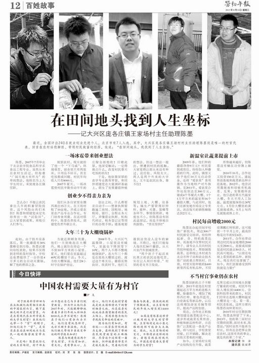 最近,全国评出240名就业创业先进个人,北京市有7人入选。其中,大兴区庞各庄镇王场村村主任助理陈墨则是唯一的村官代表。回首在农村站稳脚跟、带领村民致富的经历,他说:“在田间地头,我找到了人生坐标。”