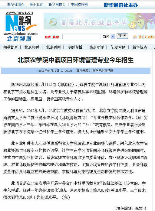 新华网北京频道4月11日电(郝海盟)北京农学院中澳项目环境管理专业今年将在北京市招收理科生55名,此专业致力于培养从事环境监测、环境保护和环境管理等工作的国际型、应用型、复合型高级专业人才。