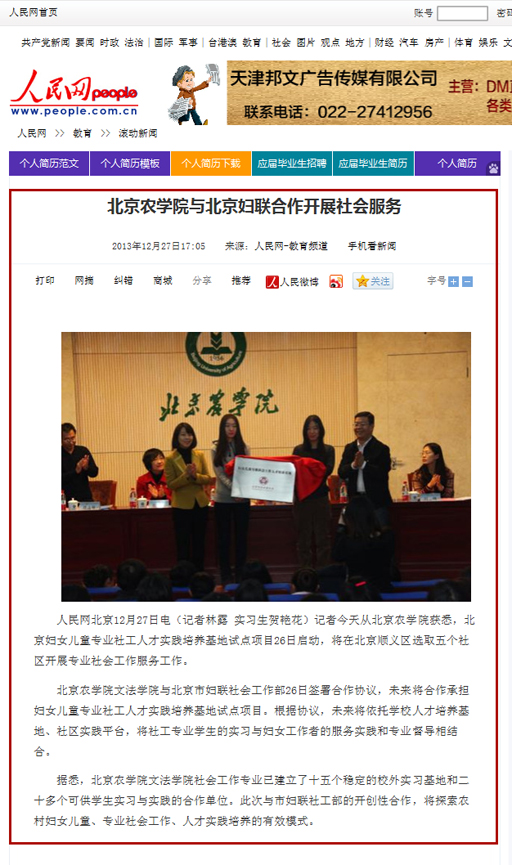 据悉,北京农学院文法学院社会工作专业已建立了十五个稳定的校外实习基地和二十多个可供学生实习与实践的合作单位。此次与市妇联社工部的开创性合作,将探索农村妇女儿童、专业社会工作、人才实践培养的有效模式。