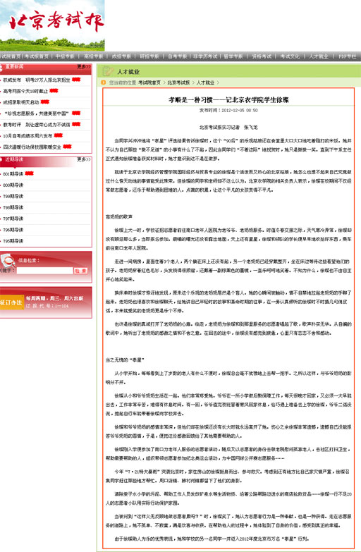 就读于北京农学院经济管理学院国际经济与贸易专业的徐璨是个活泼而又热心的北京姑娘,她怎么也想不起来自己究竟做过什么惊天动地的事情能受此殊荣。但徐璨的同学和老师却不这么认为。北京农学院的相关负责人表示,徐璨在校期间不仅经常做志愿者,还乐于帮助遇到困难的人。点滴的积累,让这个平凡的女孩变得不平凡。
